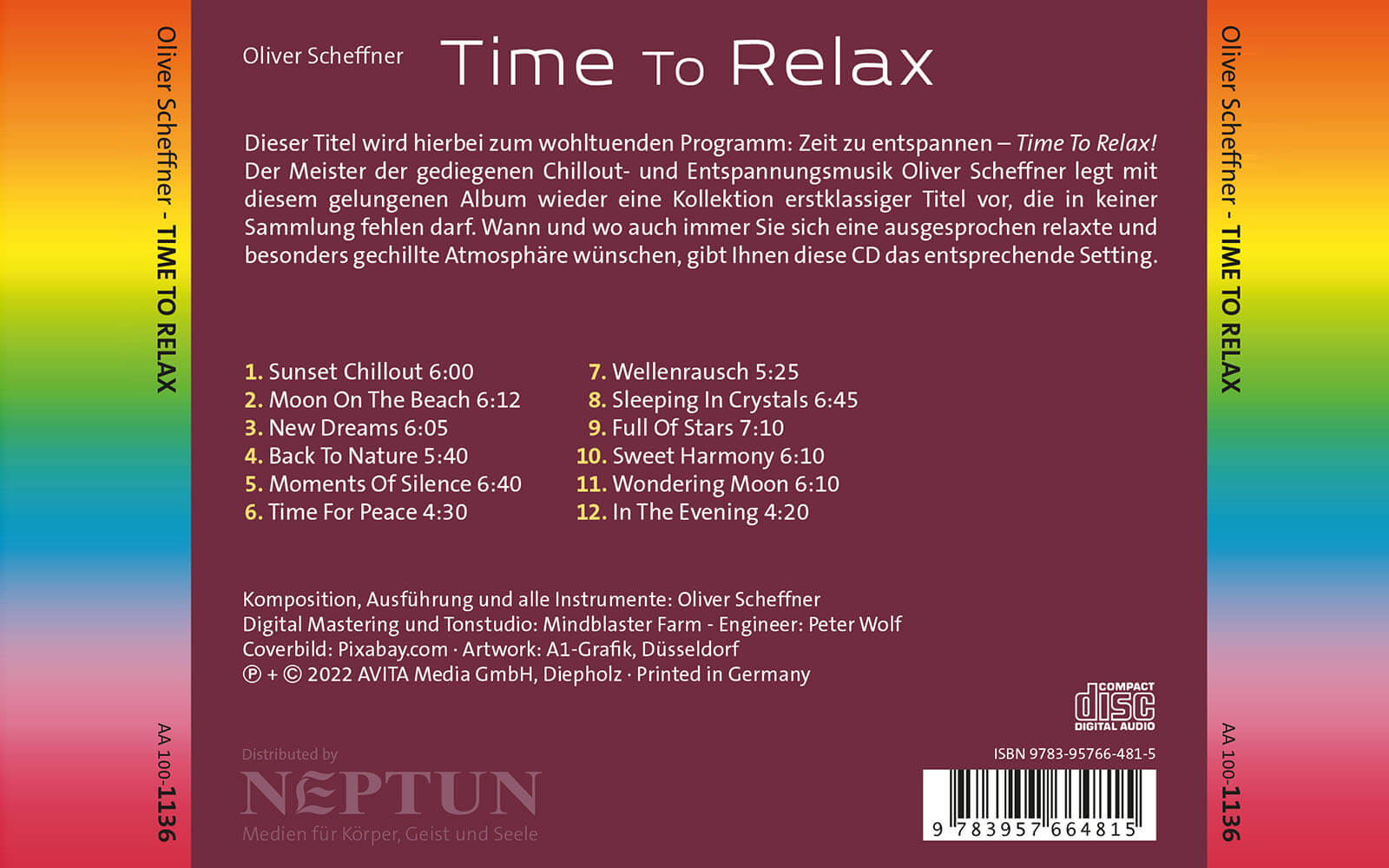 Dieser Titel wird hierbei zum wohltuenden Programm: Zeit zu entspannen – Time To Relax! Der Meister der gediegenen Chillout- und Entspannungsmusik Oliver Scheffner legt mit diesem gelungenen Album wieder eine Kollektion erstklassiger Titel vor, die in keiner Sammlung fehlen darf. Wann und wo auch immer Sie sich eine ausgesprochen relaxte und besonders gechillte Atmosphäre wünschen, gibt Ihnen diese CD das entsprechende Setting.
